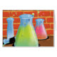 Cartoon Science Experimente. Prüflöhren und Glasflaschen vor einer Ziegelwand auf einer Holzbank.