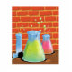 Cartoon Science Experimente. Prüflöhren und Glasflaschen vor einer Ziegelwand auf einer Holzbank.