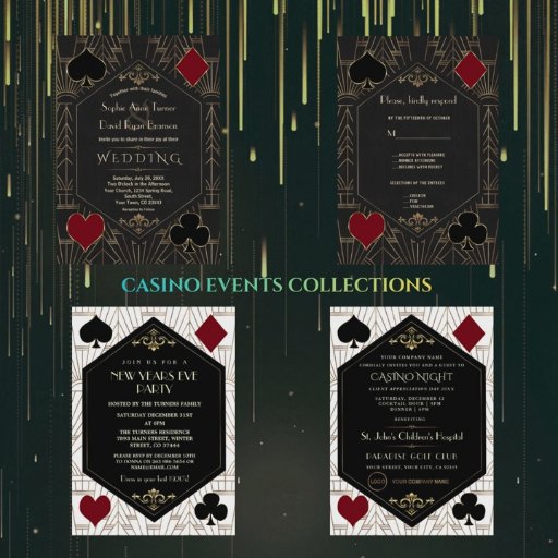 Royal, Vintage card design Great and Casino themed. It features Roaring 1920's old Hollywood Art Deco style shape, royal faux gold freer-de-lis as dividers, vintage fonts, on a gold black Art Deco pattern, as well playing cards suits with a golden edges. Use Personalize tool to add your information. For more, visit please, my Casino Poker Wedding Collection.