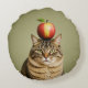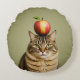 Eine lustige Katze mit einem Apfel, der auf seinem Kopf ausbalanciert.