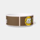 Fügen Sie dem lustigen Schüssel den Namen Ihres Haustieres hinzu, der eine Cartoon-Style-Abbildung eines Lächelns einer Katze enthält. Brauner Hintergrund.