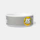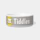 Fügen Sie dem lustigen Schüssel den Namen Ihres Haustieres hinzu, der eine Cartoon-Style-Abbildung eines Lächelns einer Katze enthält. Grauer Hintergrund.