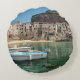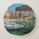 Rundes Wurfskissen mit zwei Booten im alten kleinen Hafen von Cefalu, eine alte Stadt mit gekrümmten Häusern auf der Ufergegend und eine kleine Großstadt setzen auf der Nordküste von Sizilien, Insel in Italien auf den Strand.