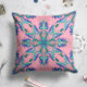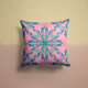 Ein traumhaftes pastellrosa Kissen mit aquamarinen und blauen Mandaladetails, die Ihnen Ausgeglichenheit, Freude und eine Touch verspielter Eleganz auf Ihrem Zuhause bringen.