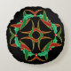 Dieses runde Kissen ist mit einer Grafik verziert, in der die durch keltische Skundenkunstwerke inspiriert bändelförmige Formen mit Kränzen aus heiligen Blätter und Beeren in einem typischen Urlaubskollektiv aus Rot und Grün mit goldgelben Akzenten dargestellt sind.