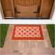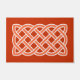 Doormat in einem keltischen, rechteckigen, kontinuierlichen Knoten Muster, symbolisiert die heilige Geometrie und die Verbundenheit des gesamten Lebens im Universum - mittelorangefarbenes Muster, in Weiß umrissen, auf einem tief mandarinorangen Hintergrund