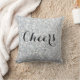 Dieses silberne Kissen hat eine funkelnd Imitat-Oberfläche und Cheers in einem extravaganten Band-Skript geschrieben. Bei der Herstellung dieses Kissens werden weder Glitzer noch Sequenzen verwendet, sodass man die gesamte Fensterwand hat und das Kissen immer noch weich zur Touch ist.