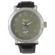 Chef's silver crossed spoon and fork Watch face displaying vintage Arabic Numerals with hours and minutes . Light numbers against olive background .Trendy item for male chefs .You can change 1 . the text " Chef L" 2 . the background color