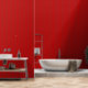 Eine ganz rote Umhüllung mit diesem Kirschrot und Tomatenrot prächtige farbige Tapete. Jedes Rot ergänzt sich, indem Rot in gleichmäßig verteilten Streifen in eine andere Höhe gebracht wird.