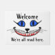 Doormat mit dem Bild von Cheshire Cat aus der Alice im Wunderland mit den Worten: "Willkommen, wir sind alle verrückt hier".