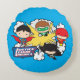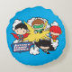 Karo aus Chibi Superman, Chibi Green Lantern, Chibi Batman und Chibi Flash kommen aus einer Explosion mit dem Justice League of America Logo.