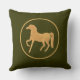 Ein schicker und individuell anpassbarer Kissen oder ein Kissen mit Scatter-Effekt, mit einem goldenen Pferdemotiv auf einem dunklen Mossy Green Hintergrund, den Sie nach Belieben ändern können. Das Pferdemotiv stammt aus einer handbemalten Illustration von Judy Adamson.