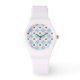 Eine schicke, Sporty White Armbanduhr, mit einem Muster aus rosa Wasserlilien und blauen Libellen, aus einer handbemalten Papierkollektion von Judy Adamson. Ein wunderschönes Geschenk für jemanden mit einem Geburtstag im Juli; Teil der Posh & Painterly 'Lily Pond' Kollektion.