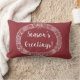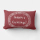 Ein festliches Lumbalkissen oder Kissen mit einem Weihnachtskranz aus Heiligem, Efeu, Poinsettias, Tannenzapfen und Tannenbaum. Dieser handgezeichnet Weihnachtskranz ist in Weiß auf tiefrotem Hintergrund, mit "Season's Greetings" in dekorativer Schrift, auch in Weiß.