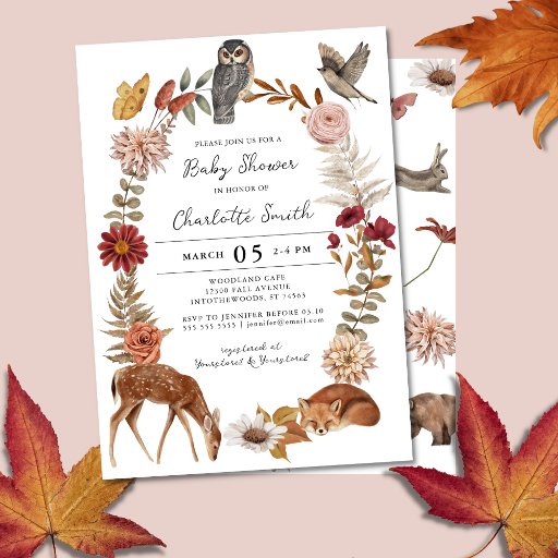 Chic Woodland Forest Animals Neutral Baby Dusche EinladungChic Woodland Forest Animals Neutral Baby Dusche Einladung (Vorderseite)Chic Woodland Forest Animals Neutral Baby Dusche Einladung (Rückseite)
