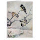 Drei schwarz-mit einer Kappe bedeckte Chickadees (Poecile atricapillus) haften Zweigen mitten in einem Schneesturm in dieser Vintagen Illustration ab 1920 an. Ein scheint, sich zu wundern, warum das andere das Hängen umgedreht ist.