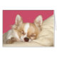 Chihuahua legt sich auf ein Kopfkissen und nimmt eine Schlummerkarte mit Foto.