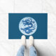 Doormat in einem chinesischen Drachenmuster, das an die alte Porzellan-China angepasst ist, in tiefindigoblau und weiß auf einem weichen, wirbelnden Hintergrund von Wolken