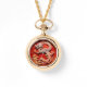 Roter Drache inspiriert durch traditionelles chinesisches Papier geschnitten in einen Kreis mit rotem Hintergrund + goldener Hintergrund. Design auf Gold Necklace Watch mit römischen Zahlen (halb transparent). Passende Grußkarte, Urlaubspostkarte und Aufkleber. Perfekt für das chinesische Holzdrachenjahr 2024.