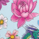 Ein chinesischer, grüner und lila Wasserdrache mit orangefarbenem Koi-Fisch, Lotus-Blume und Kirschblüten im Wasser vor blauem Hintergrund.