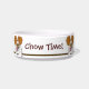 Ein niedliches Cartoon Bretagnespaniel Hund- oder Amerikaner-Bretagnespanielbild wartet liebevoll mit seiner Zunge, die heraus an dieser kundenspezifischen Schüssel der Keramik Hundenahrungsmittelhängt. Dieser Brite hat die typischen rötlich braunen, shaggy Ohren und etwas den pickeligen Mantel. Es gibt 6 von ihnen fast vollständig gehend um den Teller. Es sagt "Chow-Chow Zeit!" in der Mitte.