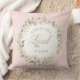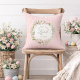 This pillow design has a wreath of pink flowers in a wreath with a pink striped background with text that says "Christ the Lord is Risen."