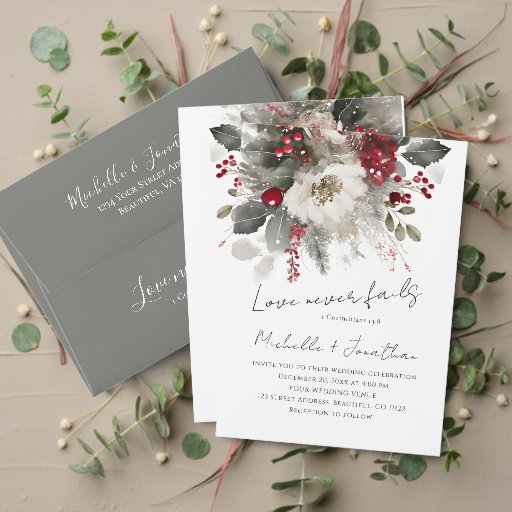 Christliche Hochzeitseinladung zeigt eine elegante Weihnachten-, Winter florale Wasserfarbe mit weißen Blume, roten Beeren, silbernen heiligen Blätter und Kiefer. Es enthält inspirierende Zitatvorstellung aus Bibel Verse 1 Korinther 13:8, "Lover versage nie." Die Rückseite zeigt einen Teil der Verse 1 Korinther 13 7-8, "LIEBE... hofft alles, hält alles, Liebe nie versage." Diese Seite kann für einen ganz besonderen Zweck gerahmt werden. Wenn Sie etwas nicht sehen oder Änderungen wünschen, kontaktieren Sie mich bitte mit dem Chat-Button auf der Zazzle-Seite.