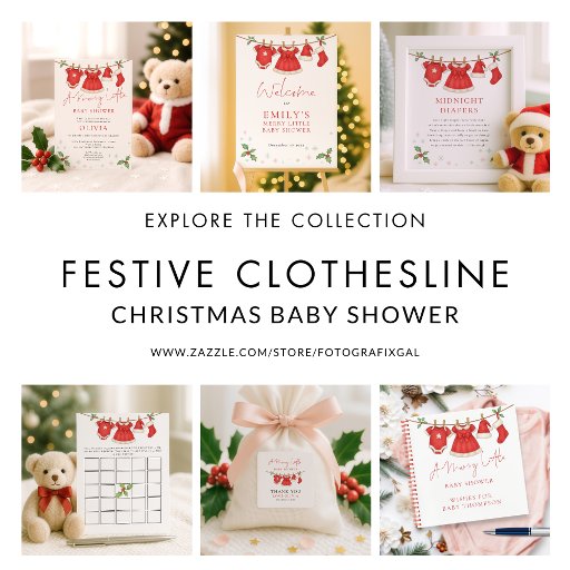 Christmas Clothesline Merry Little Baby Shower. Minimalist style with a set non-editable script for the words “A Merry Little” and easily personalise the rest of the text to your details. A clothesline with festive baby clothes is in the centre.