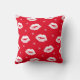 Weihnachten küsst rot-weiß gemusterten Wurfkissen. Fest rotes Kissen mit einem Muster von Lippenstiftküssen und Schneeflocken.