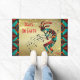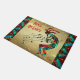 Personalisieren Sie diese einzigartige "Eine von einem Kind" Weihnachten Kokopelli Doormat! Es besitzt einen Kokopelli, der die Flute mit Musiknoten spielt und auf einem goldenen Weihnachtsgebirge mit Schneeflocken tanzt, umgeben von türkisfarbenen, orangen und schwarzen Grenzen und den aufsteigenden Worten.."Weltfrieden"! Original Art Design von Künstler Kerry Miller.