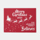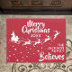 Zeigen Sie, wie sehr Sie an den Zauber von Weihnachten und Weihnachtsmann glauben, mit dieser Weihnachtsmatte, die die Silhouette des Schlittens des Weihnachtsmannes in Weiß mit seinen Rentieren zeigt, die auf einem Sternenpfad fliegen. Die Titelschrift auf oben liest Frohe Weihnachten in weißer handgeschriebener Schrift. Der Text ist leicht an Ihre Wünsche, das Jahr, den Familiennamen oder den Firmennamen anzupassen. Diese Türmatte ist die perfekte Weihnachtsdekoration für Ihre Zuhause