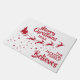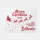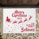 Zeigen Sie, wie sehr Sie an den Zauber von Weihnachten und Weihnachtsmann glauben, mit dieser Weihnachtsmatte, die die Silhouette des Schlittens des Weihnachtsmanns in Rot mit seinen Rentieren zeigt, die auf einem Sternenpfad fliegen. Die Aufnahme oben liest Frohe Weihnachten in festlich rot handgeschriebenen Schriften. Der Text, in einem roten, eleganten Schriftart, lässt sich leicht an Ihre Wünsche, das Jahr, den Familiennamen oder den Firmennamen anpassen. Diese Türmatte ist die perfekte Weihnachtsdekoration für Ihre Zuhause