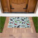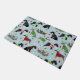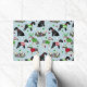 Niedliche Weihnachtsschnauzer mit Salz und Pfeffer und Schwarz- und Silbermäntel tragen Weihnachtsmannmützen, Geweih- und Raute-Pullover auf blauem Hintergrund mit verstreuten Ziergegenständen.