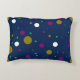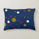 Ein Muster von Kreise unterschiedlicher Größe in Gold, Weiß, lila und Grün ist auf einem dunkelblauen Hintergrund verstreut. Die Kreise sind gleichmäßig verteilt und variieren im Durchmesser.
