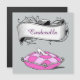 Eine benutzerdefinierte Magnetvorlage mit lila Schriftzeichen auf einem Vintagen Banner, mit einer Ätzung des Aschenputtelglases auf einem rosa Kissen.