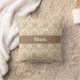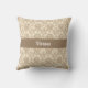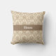 Ein schönes Vintages Damast-Muster in Beige auf blassbraunem Hintergrund schafft ein elegantes Kissen. Personalisieren Sie mit Ihrem Namen in einer dunkelbeige Band in der Mitte.