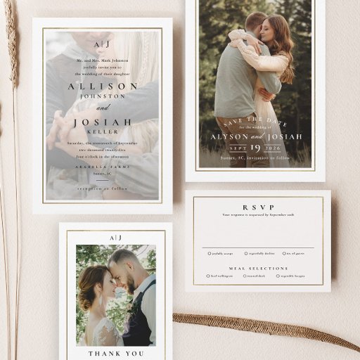 Diese klassische, elegante Gold Wedding Einladung ist einfach und vielseitig. Es zeichnet sich durch ein elegantes Schwarz-Weiß-Design mit einem Monogramm, einem einfachen goldenen Rahmen und einem formell bearbeitbaren Text aus. Klicken Sie auf die Schaltfläche Bearbeiten, um dieses Design anzupassen.