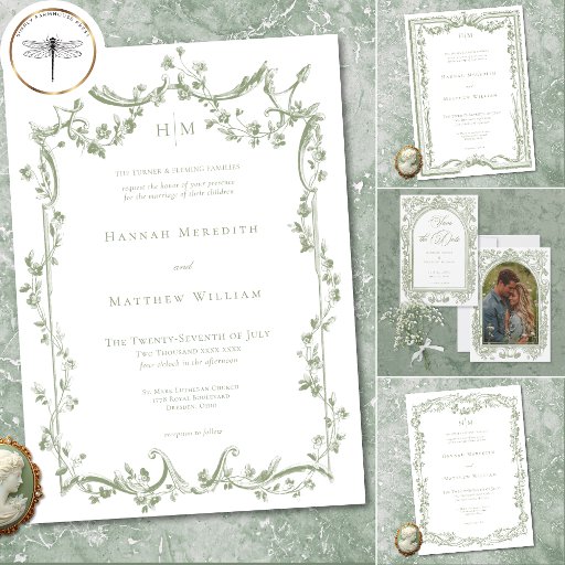 Announce your special day with an elegant traditional wedding save the date card featuring a delicate, vintage-style floral border in soft sage green. Perfect for a formal ceremony or an affair with a classic, timeless aesthetic. This refined design offers an opulent look. Created by Simply Farmhouse Press.