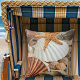 Ein modernes Design-Kissen mit Muscheln und Seestern. Schöne Lage für ein Strandhaus oder wenn Sie nach einer küstennahen Atmosphäre suchen.