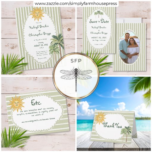 This whimsical coastal wedding all in one wedding invitation features a vintage sun motif, lace border, palm tree, and stylish sage green stripe background. Perfect for a beach or California destination wedding. Created by Simply Farmhouse Press.