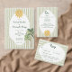 This whimsical coastal wedding all in one wedding invitation with a QR code features a vintage sun motif, lace border, palm tree, and stylish sage green stripe background. Perfect for a beach or California destination wedding. Created by Simply Farmhouse Press.