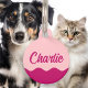 Pet ID Tag mit dem Namen Ihres Haustieres in Weiß auf einem hellrosa Hintergrund mit der Telefonnummer auf der Rückseite. Schriftart und Farben sind im Designwerkzeug anpassbar.