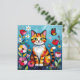 A sweet card with a cute illustration of a colorful abstract cat surrounded by flowers, butterflies and the sun in a paper quilling impasto style.