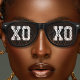 Coole schwarze Retro-Sonnenbrille mit dem Text "XOXO". Große Sommer- oder Party-Brille für Damen und Herren.