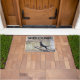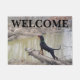 Diese Türmatte hat ein Foto einer schwarz-bräunlichen Münzhunde am Fluss und das Wort WELCOME über der Oberseite.