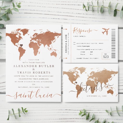 Copper World Map Hochzeit in Urlaubsort Einladung