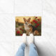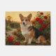 A tri-colored Corgi sitting amidst red roses during golden hour. The scene is depicted with the rich texture and soft lighting of a classical oil painting.