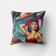 A confident, retro-style woman among the planets and rockets that surround the guests at the beach. The vivid colors, bold energy, and vintage theme pay tribute to the thrilling imagination of midcentury book covers and movie posters.