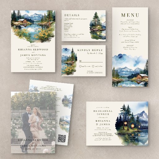 Hochzeitseinladung mit Aquarelllandschaft. Dieses Kunstwerk vereint die ätherische Schönheit einer abgeschiedenen Holzverglasung, gebadet von gedämpftem Sonnenlicht, das durch Zedern- und Rotholzbäume gefiltert wird. Unter den Bäumen tanzt ein Teppichboden aus dunkelgelben Wildblumen und schafft eine traumhafte Kulisse direkt aus einem Märchenbuch. Die sanften Aquarelltöne erinnern an den stillen Zauber des Waldes und bieten eine perfekte Repräsentation einer bezaubernden Waldhochzeit. Dieses Design ist ideal für Paare, die eine märchenhafte Holzhochzeit oder eine intime Waldhochzeit wünschen. Seine kahle Atmosphäre verbindet sich wunderbar mit der Dämmerung von Hochzeiten oder Veranstaltungen in einer natürlichen Umgebung mit Bergaussichten durch die unberührte Schönheit der Natur. Ideal für eine Hochzeit im Rotwald oder für einen romantischen Hochzeitsort am See, findet dieses Stück seinen Widerhall bei denjenigen, die sich den Zauber einer Hochzeit im Freien zu Eigen machen möchten. Durchsuchen Sie meine Country Lake Wedding Kollektion für die Koordination von Einladungen, Schreibwaren, Schildern und Hochzeitsdekor. Melde mich, wenn du weitere Vorlagen hinzufügen willst.
