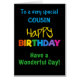 Eine bunte Geburtstags-Karte für einen Cousin, mit hell farbiger Beschriftung auf einem schwarzen Hintergrund, dem Wort "glücklich" im Gelb und dem Wort "Geburtstag" in den Regenbogenfarben.